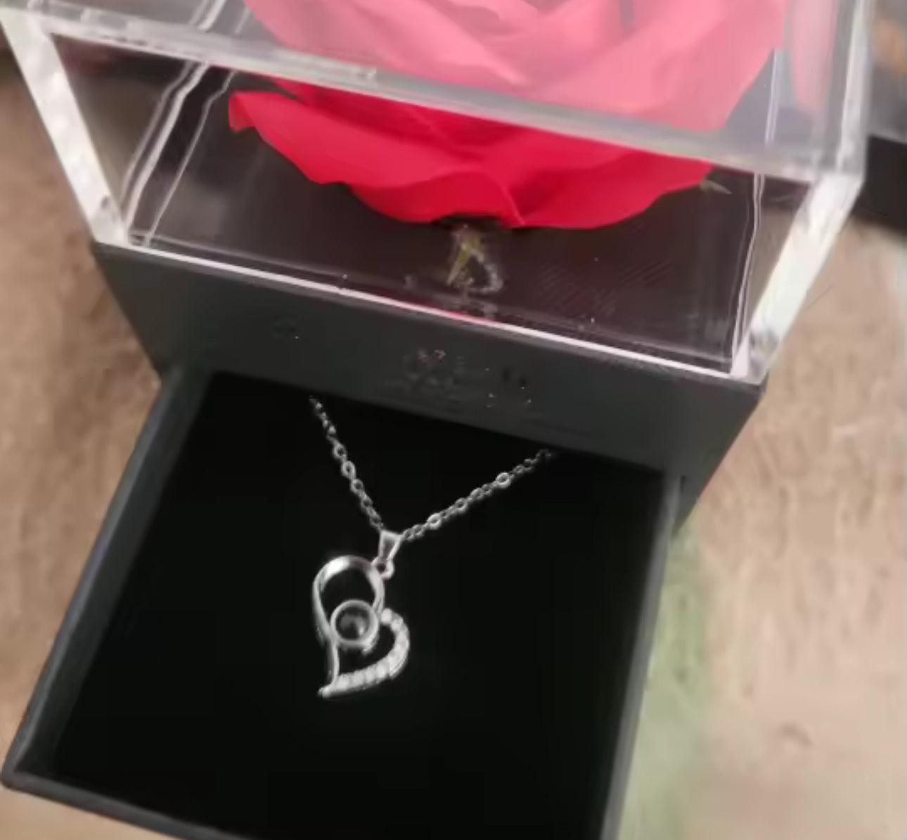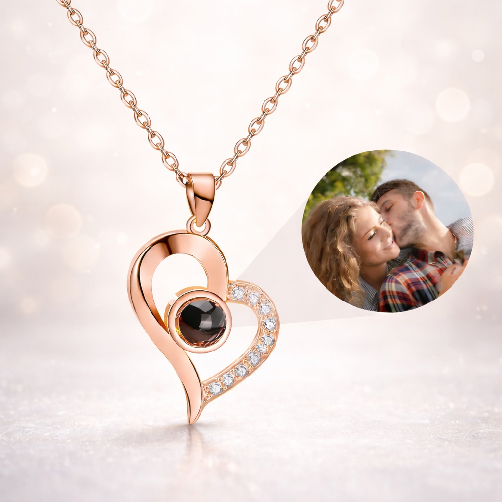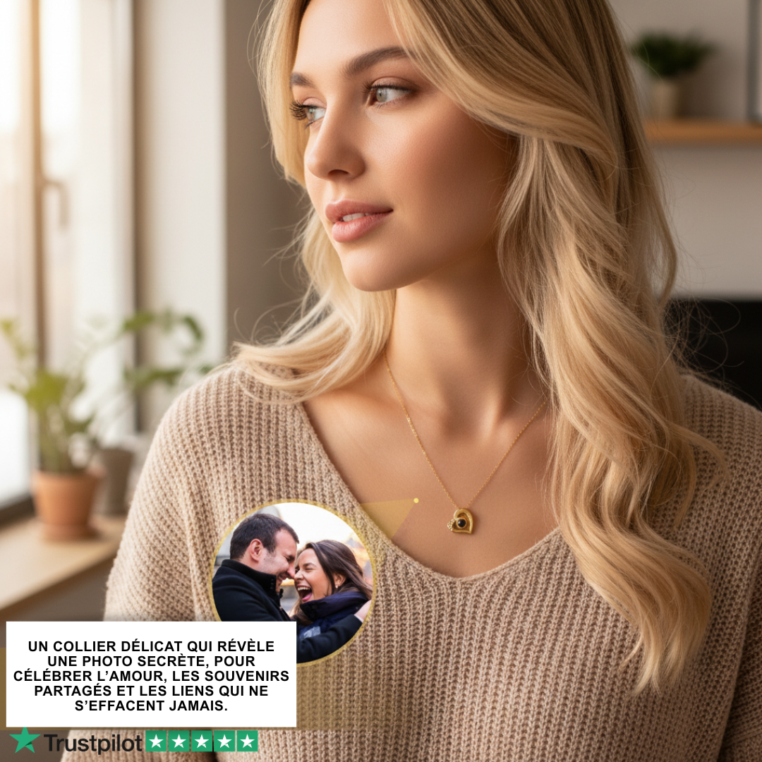 Ce collier en forme de cœur renferme une photo précieuse, visible à l’intérieur ou par projection de lumière. Un cadeau unique et chargé d’émotion pour célébrer un lien d’amour inoubliable.
