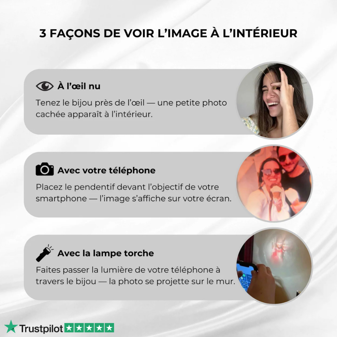Notre collier photo personnalisé vous permet de regarder votre photo dans la perle de projection de trois façons différentes :